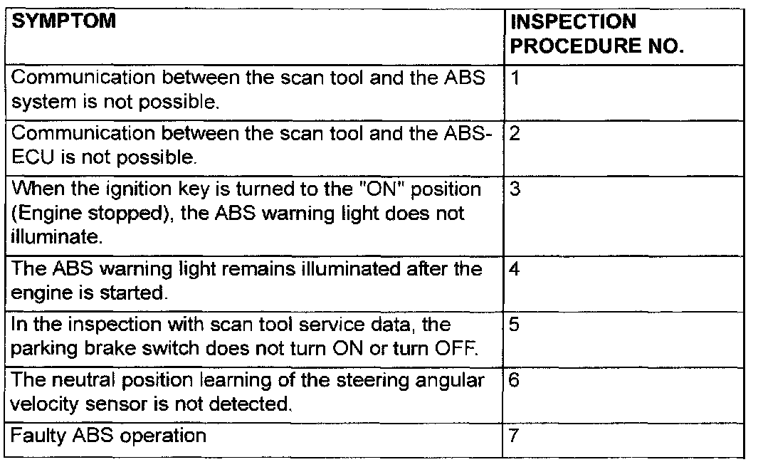 SYMPTOM CHARTNOTE: If steering movements are made when driving at high speed, or when driving on road surfaces with low frictional resistance, or when passing over bumps, the ABS may operate although sudden braking is not being applied. Because of this, when getting information from the customer, check if the problem occurred while driving under such conditions as these.