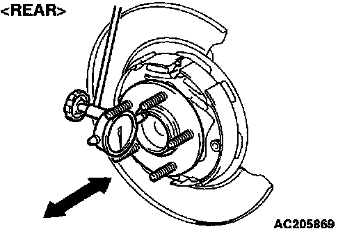 2. Remove the brake disc Then place a dial gauge as shown, and measure the end play by pushing and pulling the wheel hub