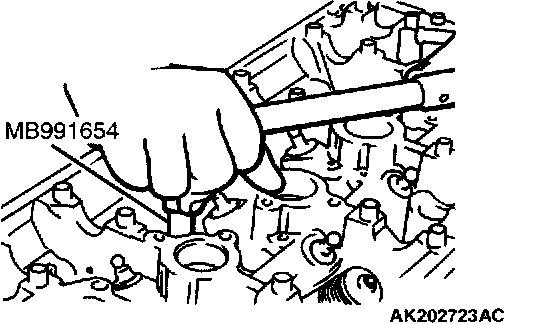 Using the special tool MB991653 to loosen the cylinder head bolts.