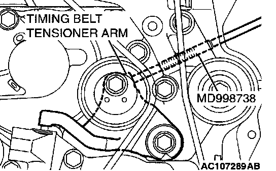 3. Screw in the special tool MD998738 until it comes in contact with the timing belt tensioner arm.