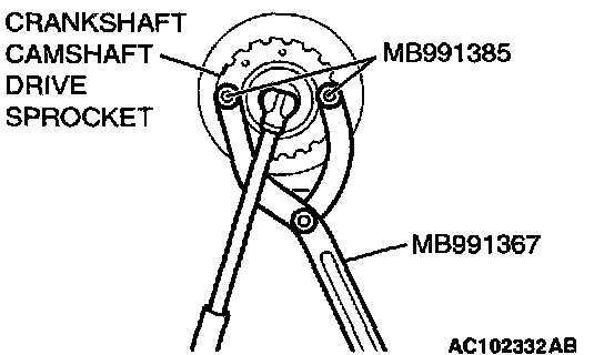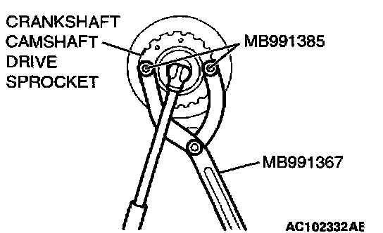 1. Hold the crankshaft camshaft drive sprocket with special tools MB991367 and MB991385.