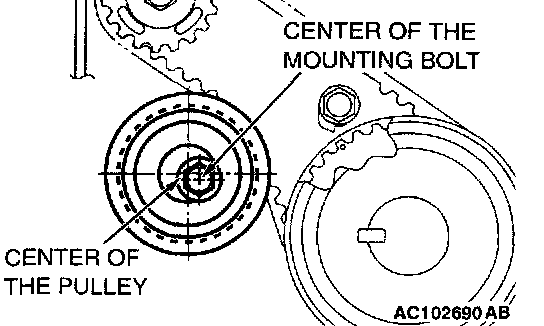CAUTION: When tightening the mounting bolts, ensure that the timing belt tensioner pulley does not rotate with the bolts. Allowing it to rotate with the bolts can cause deficient tension of the belt.