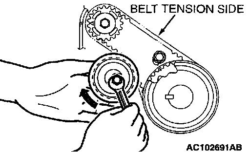 CAUTION: Install the valve timing belt. Then apply reverse rotation (counterclockwise rotation) pressure to the cam shaft sprocket. Re-check to see that each timing mark is aligned while the tension side of the belt is tight.
