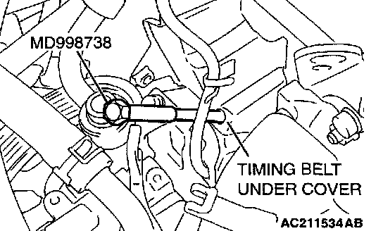 CAUTION: The special tool MD998738 can be gradually installed at a rate of a 30 degree turn per second. If it is screwed in all at once, the timing belt tensioner adjuster rod will not easily retract and the special tool MD998738 may bend.