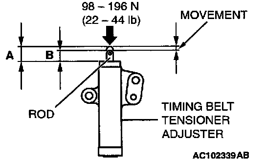 3. Hold the timing belt tensioner adjuster by hand, and press the top end of the rod onto the metal (e.g. cylinder block) under a pressure of 98 - 196 N (22 - 44 pounds) to measure the movement of the rod.
