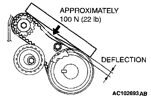 3. Apply a pressure of approximately 100 N (22 pounds) at the center (arrow area) between the sprocket as shown, then inspect whether the belt deflection is within the standard value.