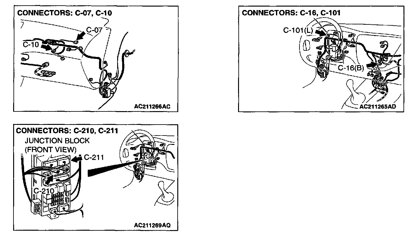 NOTE: Also check intermediate connector C-10, joint connector 2. C-101, junction block connectors C-210 and C-211 for loose, corroded, or damaged terminals, or terminals pushed back in the connector. If intermediate connector C-10, joint connector 2. C-101, junction block connectors C-210 or C-211 is damaged, repair or replace the connector as described in Harness Connector Inspection.