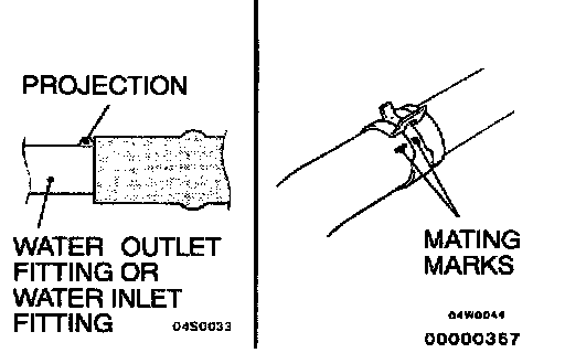 Make mating marks on the radiator hose and the hose clamp. Disconnect the radiator hose.