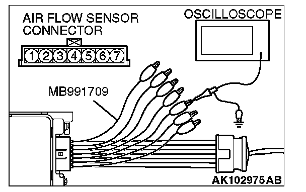 1. Disconnect the volume airflow sensor connector, and connect the test harness special tool (MB991709) in between. (All terminals should be connected.)