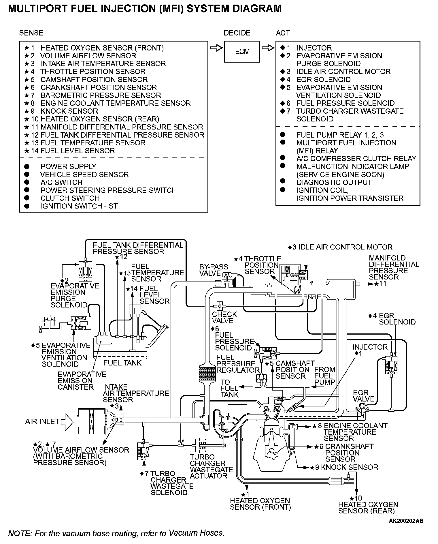 The Multiport Fuel Injection System consists of sensors, actuators and the engine control module (ECM). The sensors detect the engine condition. The module controls the system based on signals from these sensors. The actuators work under the control of the ECM. The ECM carries out activities such as fuel injection control, idle air control, and ignition timing control. In addition, the ECM is equipped with several diagnostic test modes which simplify troubleshooting when a problem develops.