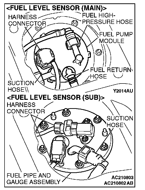 CAUTION: When inserting the fuel pump module or fuel pipe and gauge assembly into the fuel tank, be careful not damage the sensor unit and the float.