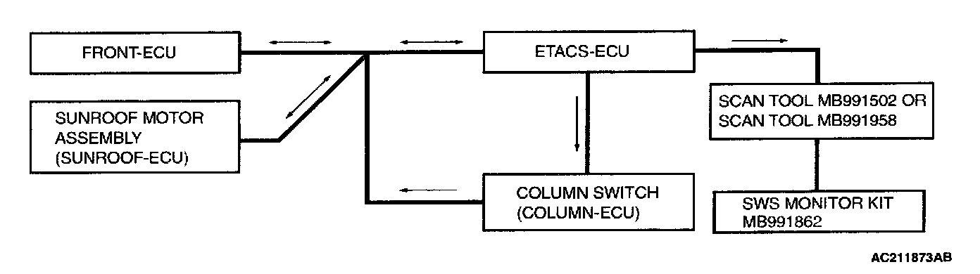 As shown signal wires used exclusively for transmitting multiplex signal data connect the ETACS-ECU, front-ECU, column switch (incorporating the column-ECU) and sunroof motor assembly (incorporating the sunroof-ECU) and these components communicate with each other.