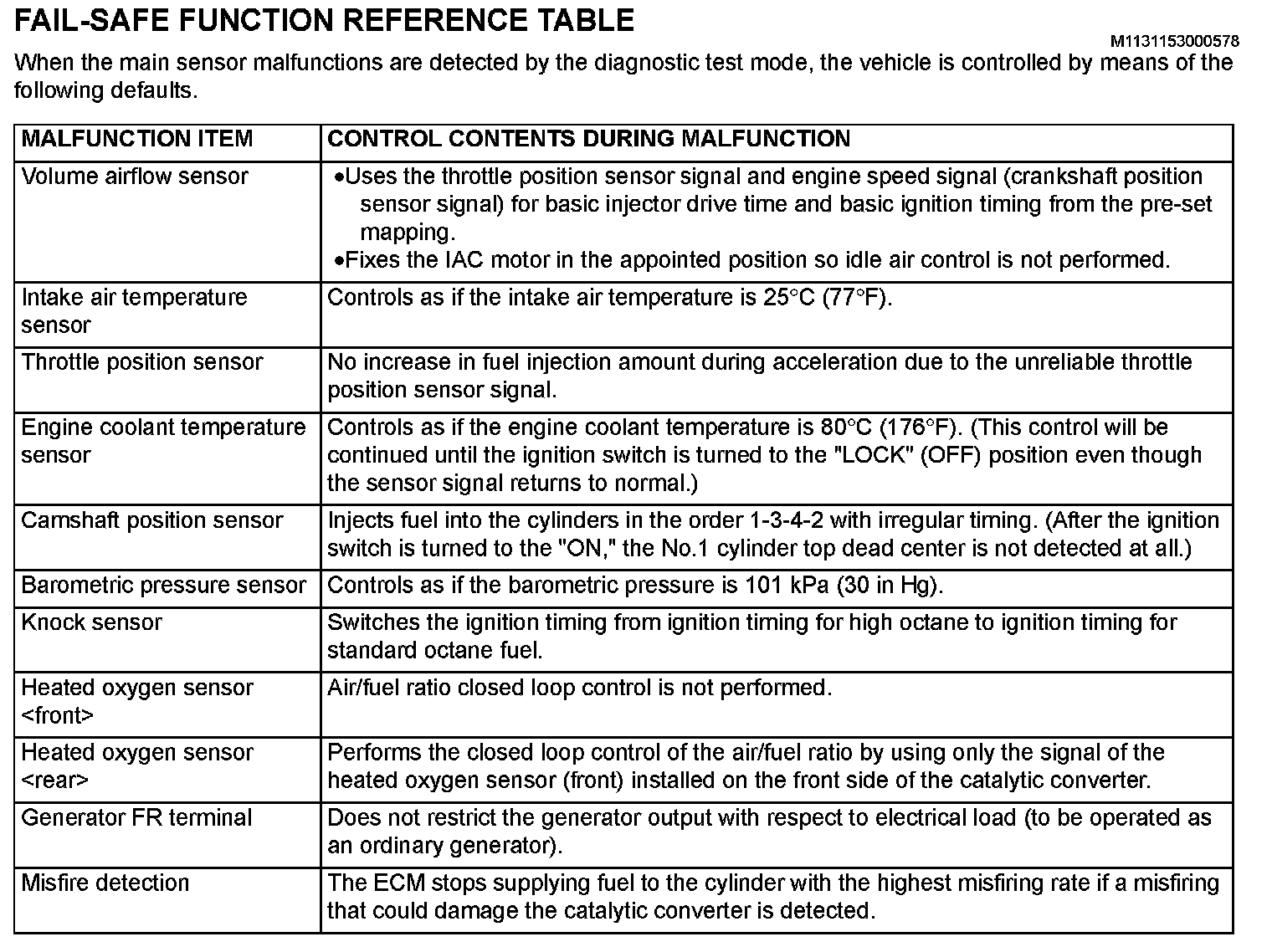 When the main sensor malfunctions are detected by the diagnostic test mode, the vehicle is controlled by means of the following defaults.