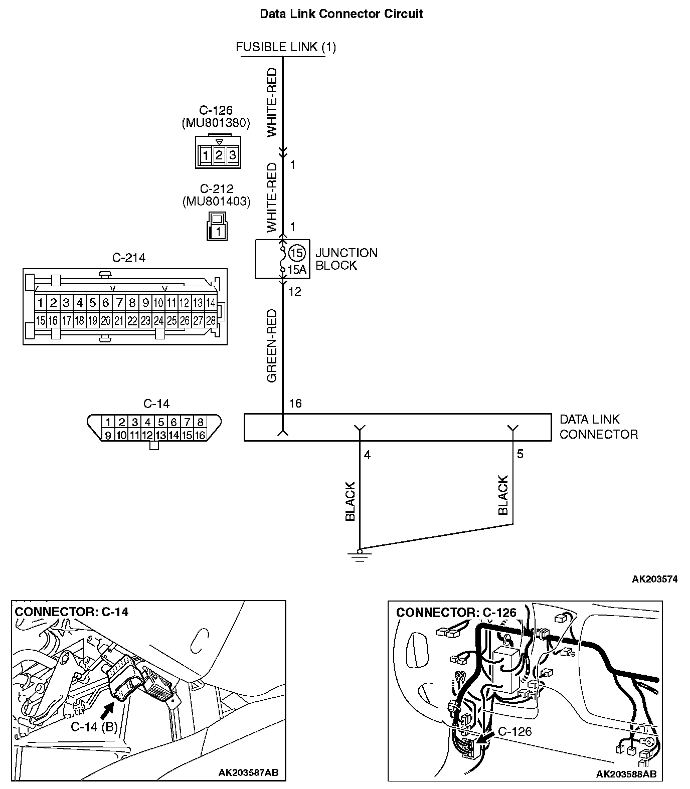 NO: Check harness connectors C-126, C-212 and C-214 at intermediate connector for damage, and repair or replace as required. Refer to Harness Connector Inspection. If intermediate connectors are in good condition, repair harness wire between fusible link (1) and data link connector C-14 (terminal No. 16) because of open circuit. Then confirm that the malfunction symptom is eliminated.