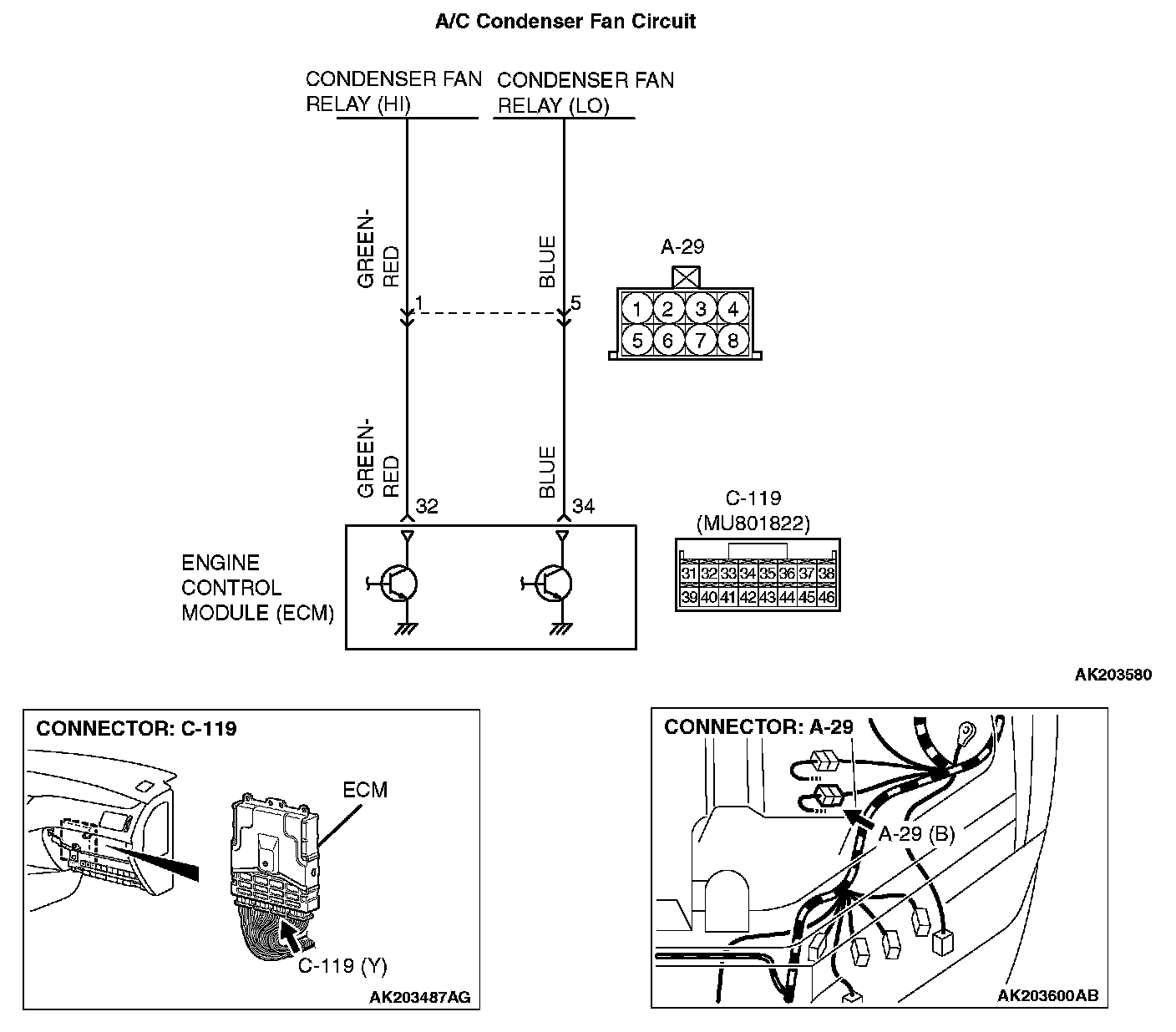 - The battery positive voltage is applied on the ECM (terminal No. 34) from the condenser fan control relay (LO).