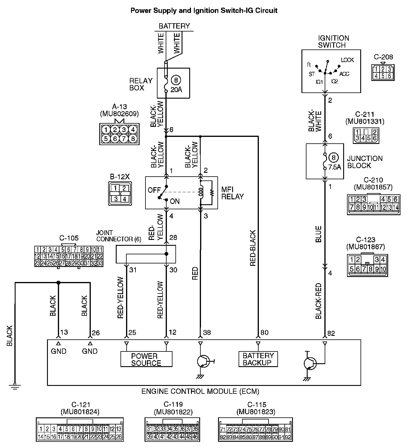 - When the ignition switch is turned to the "ON" position, the battery positive voltage is applied to the ECM (terminal No. 82). When the battery positive voltage is applied, the ECM turns the power transistor in the ECM "ON" and grounds the MFI relay coil. With this, the MFI relay turns "ON" and the battery positive voltage is supplied to the ECM (terminals No. 12, No. 25) from the MFI relay (terminal No. 4).