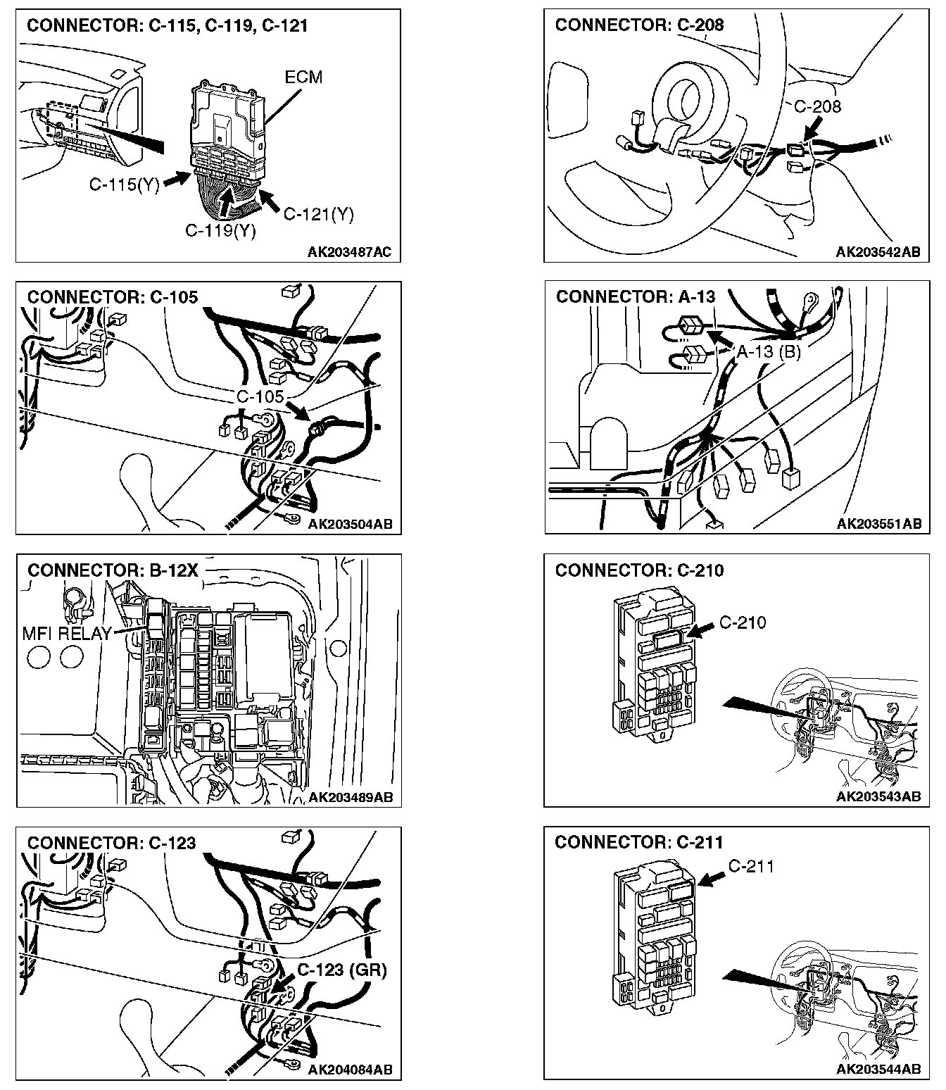 NO: Check harness connector C-123, C-210 and C-211 at intermediate connector for damage, and repair or replace as required. Refer to, Harness Connector Inspection. If the intermediate connectors are in good condition, repair the harness wire between ignition switch connector C-208 (terminal No. 2) and ECM connector C-115 (terminal No. 82) because of open circuit. Then confirm that the malfunction symptom is eliminated.
