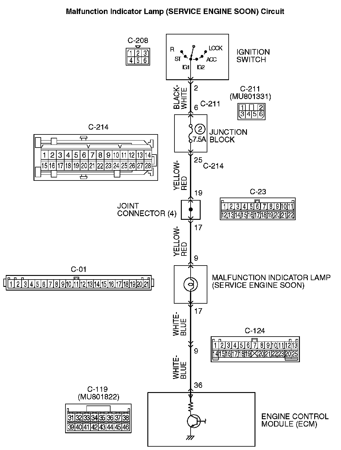 - Short-circuit between the malfunction indicator lamp (SERVICE ENGINE SOON) and ECM.