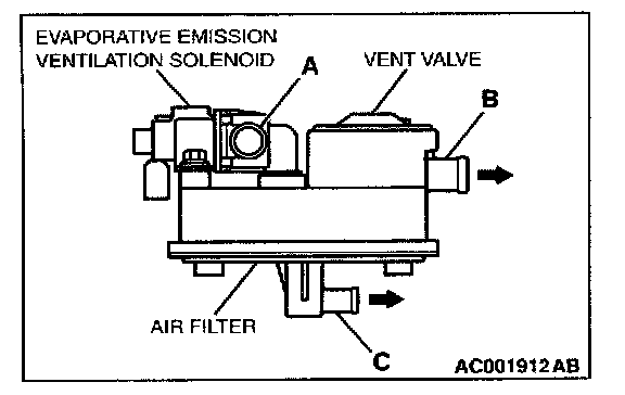 ORVR VENT VALVE MODULE CHECK1. Blow air through orvr vent valve module nipple (A). Check that the air flows out of nipple (B) and nipple (C).