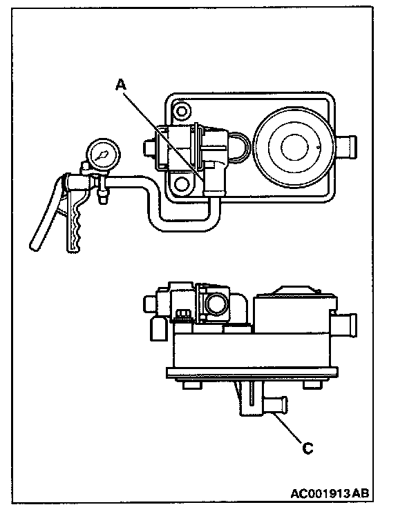 3. With air flow through nipple (C) obstructed, apply a vacuum and check that the vacuum is maintained.