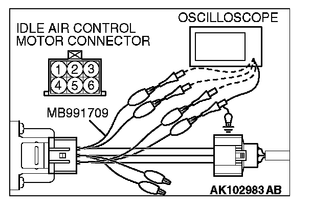 2. Connect the oscilloscope probe to the idle air control motor connector terminal No. 1, terminal No. 3, terminal No. 4 and terminal No. 6 respectively.