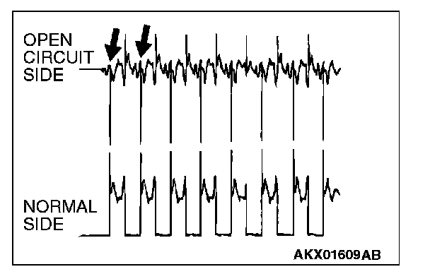 - Current is not supplied to the motor coil on the open circuit side. (Voltage does not drop to 0 volt.) Furthermore, the induced electromotive force wave pattern at the normal side is slightly different from the normal wave pattern.