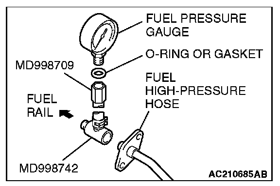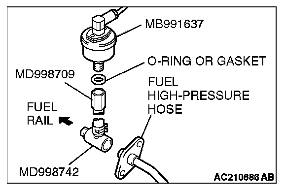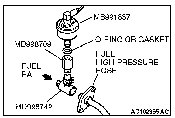 b. Place a suitable O-ring or gasket on assembled special tools MD998709 and MD998742 and install the fuel pressure gauge.