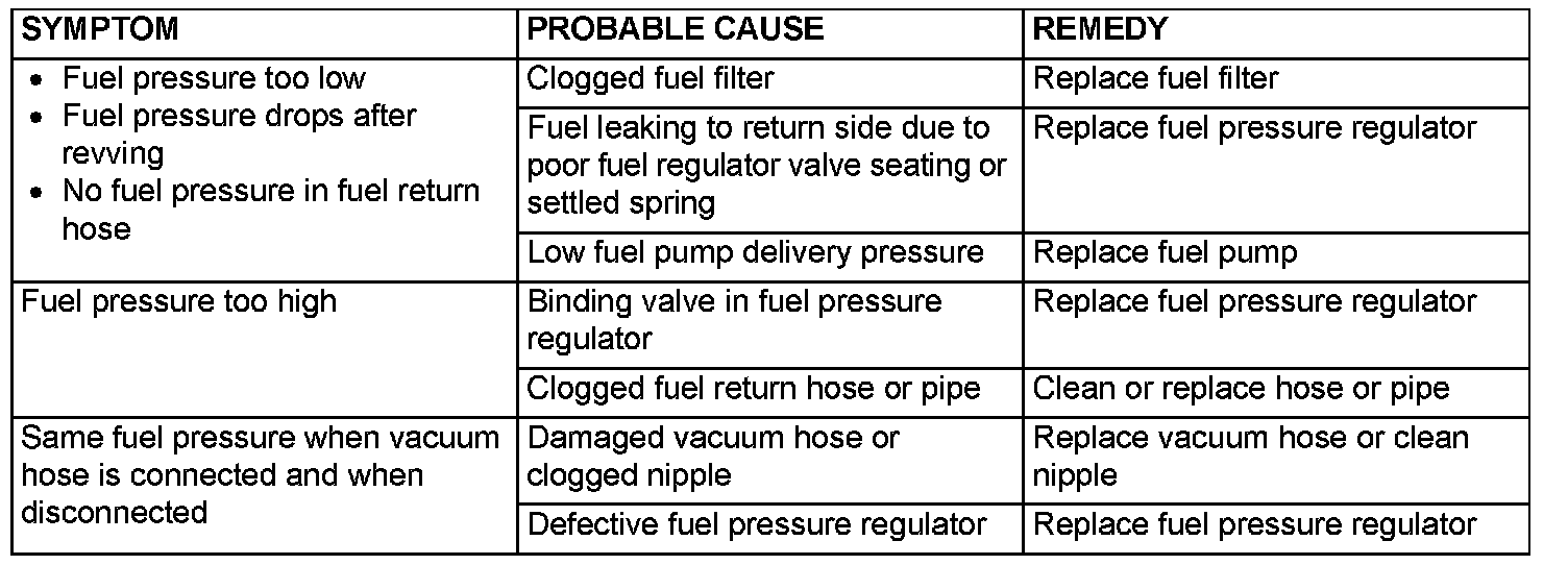 14. If any of fuel pressure measured in steps 10 to 13 is out of specification, troubleshoot and repair according to the given table.