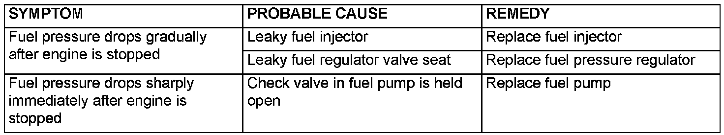 15. Stop the engine and observe fuel pressure gauge reading. It is normal if the reading does not drop within two minutes. If it does drop, observe the rate of drop page and troubleshoot and repair according to the table. Start, then stop the engine.