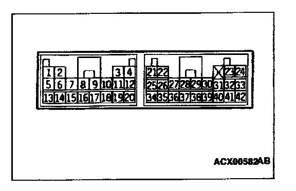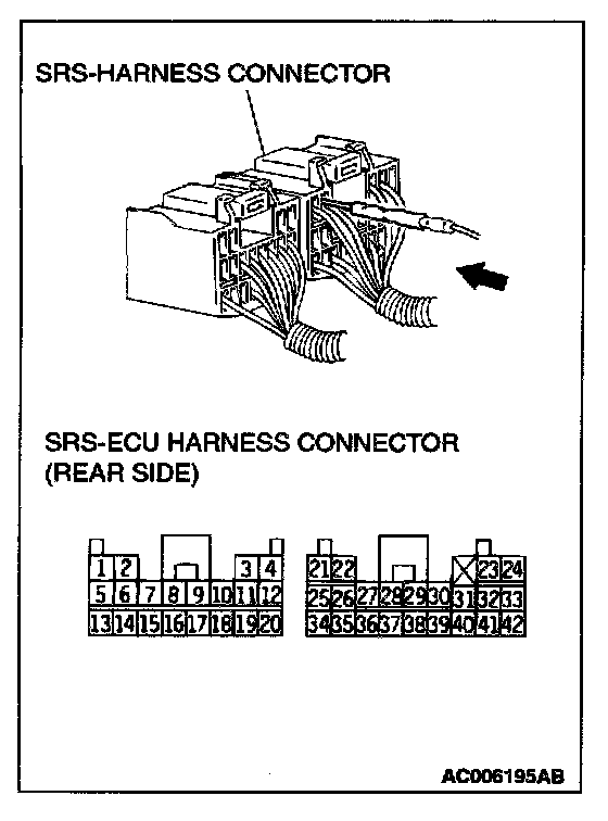 Inspection of the SRS-ECU connector harness should be carried out by the following procedure. Insert the backprobing tool into connector from harness side (rear side), and connect the tester to backprobing tool. If any tool other than backprobing tool is used, it may cause damage to the harness and other components. Furthermore, measurement should not be carried out by touching the backprobing tool directly against the terminals from the front of the connector. The terminals are plated to increase their conductivity, so if they are touched directly by the backprobing tool, the plating may break, which will decrease reliability.