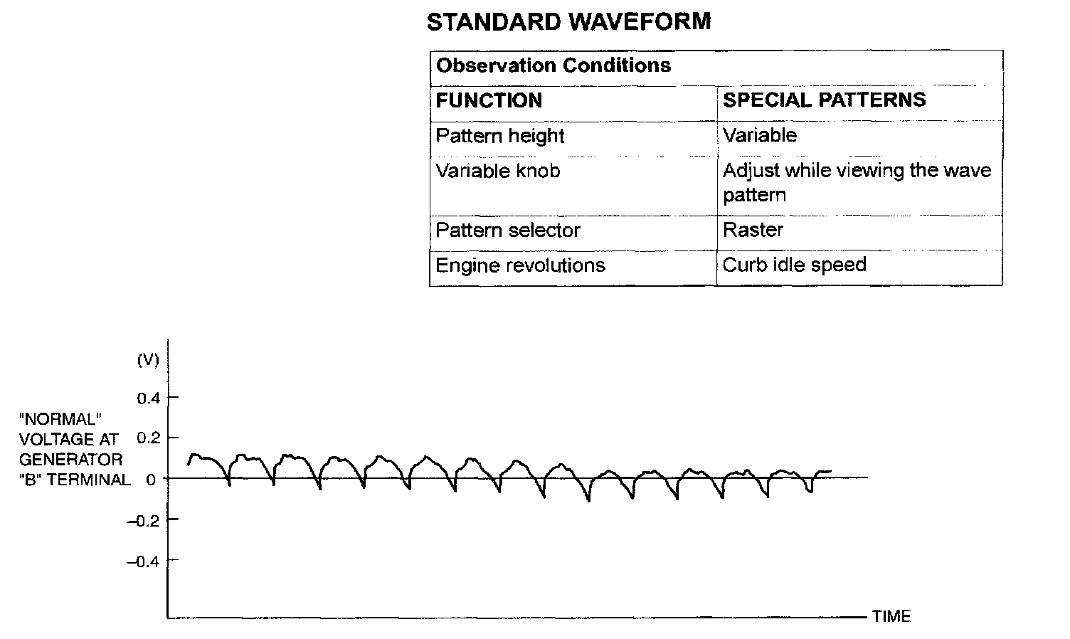 NOTE: The voltage waveform of the generator "B" terminal can undulate as shown. This waveform is produced when the regulator operates according to fluctuations in the generator load (current), and is normal for the generator. If the ripple height is abnormally high (approximately 2 V or more during idling), the wires between the generator B terminal and the battery have broken due to fuse blowing, etc. The generator is usually operating properly.