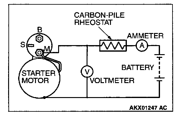 2. Connect a test ammeter (100-ampere scale) and carbon pile rheostat in series between the positive battery terminal and starter motor terminal.