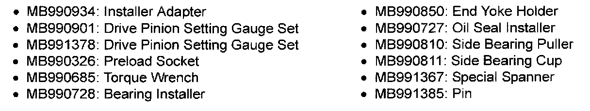 2. Install special tools MB990903 (MB990901) and MB991366 (MB991378), drive pinion front and rear bearing inner races to the differential carrier as shown in the illustration.
