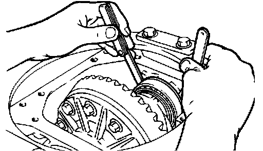 2. Press the differential case to one side to measure the clearance of the side bearing outer race and the differential carrier.
