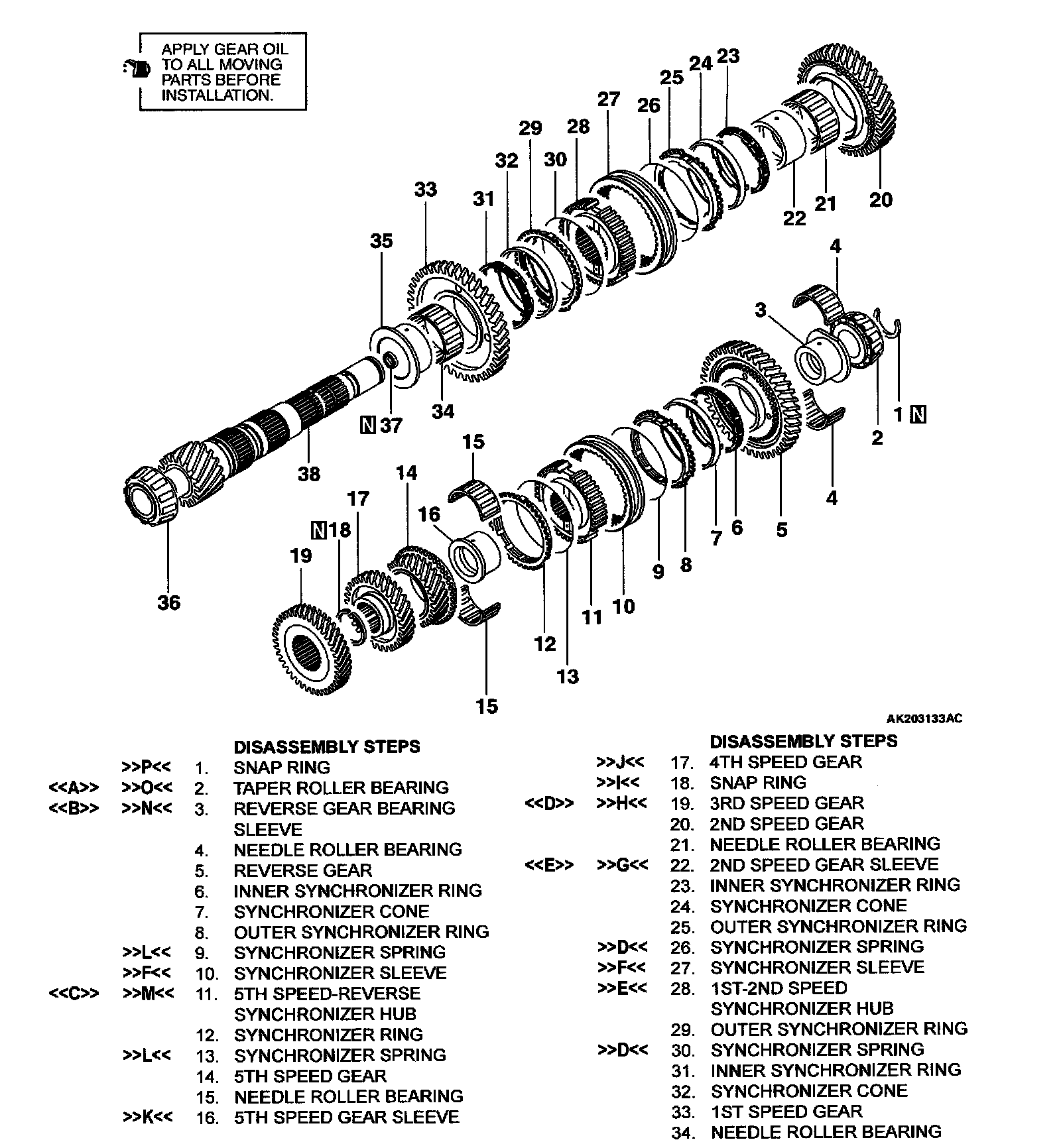 1. Make sure the synchronizer ring, reverse gear and needle roller bearing have been correctly installed.