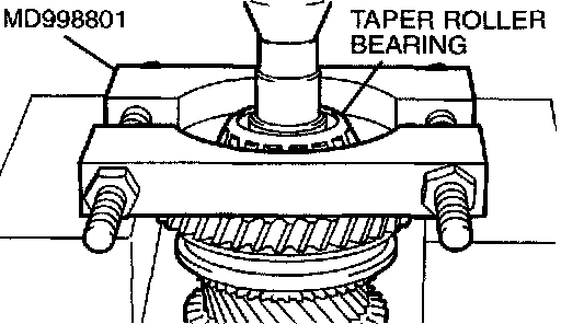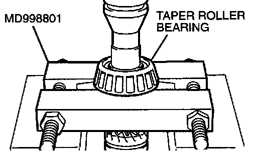 1. Using special tool MD998801, support the taper roller bearing, and then set them on the press.