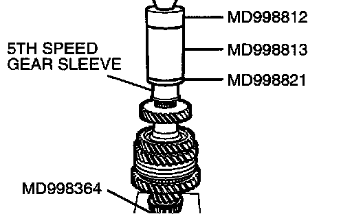 Using special tools MD998812, MD998813, MD998821 and MD998364, press install the 5th speed gear sleeve onto the output shaft.