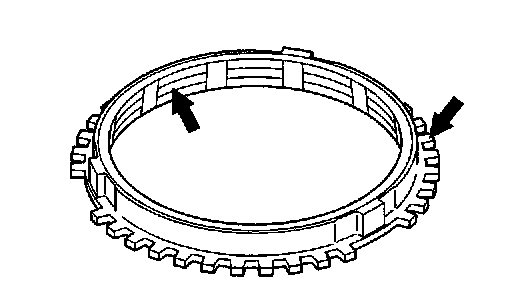 2. Install the synchronizer sleeve so that the areas with teeth that have raised tips (three areas total) are aligned with the areas on the synchronizer hub that have deep grooves between the teeth (three areas total).