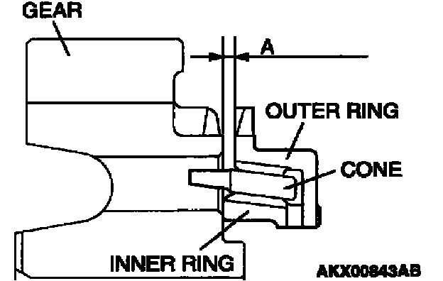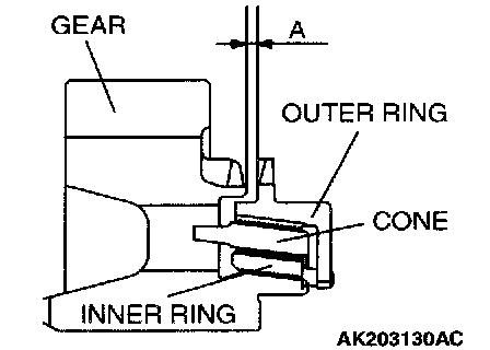 2. Install the outer ring, inner ring and cone, force them toward the gear, and check clearance "A". If "A" is less than the limit, replace them as a set.