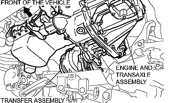 With the engine mount and transaxle assembly towards the front of the vehicle, remove the transfer assembly from between the engine block and crossmember.