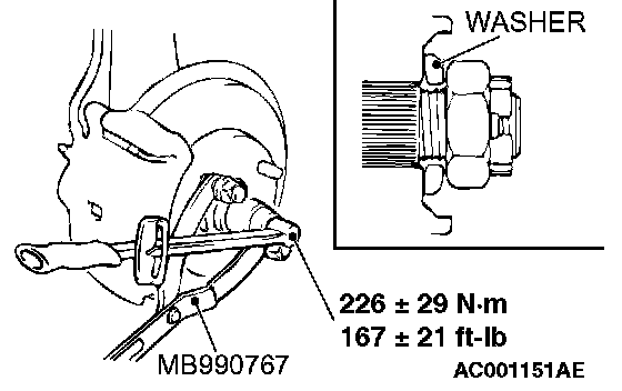 2. Using special tool MB990767, tighten the drive shaft nut to the specified torque.