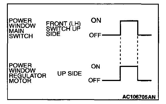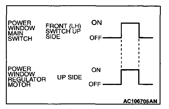 When the front (LH) switch on the power window main switch is pulled up, the system energizes its respective power window regulator motor, and then the driver's window glass rises.