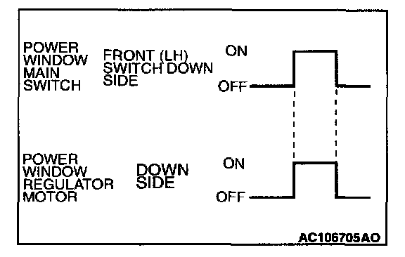 When the front (LH) switch on the power window main switch is pushed down fully, the system energizes its respective power window regulator motor, and then the driver's window glass moves to its lowest position.