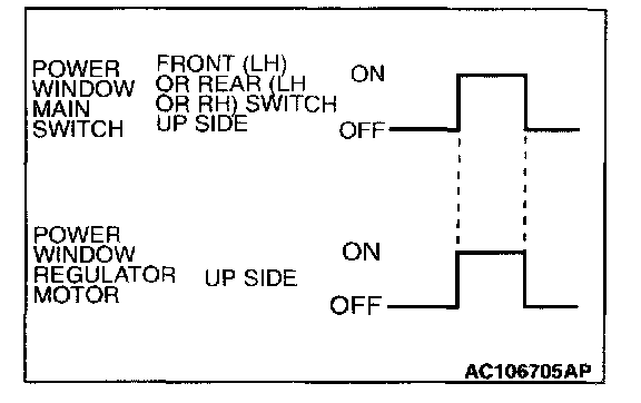 When the front (RH) or rear (LH or RH) switch on the power window main switch is pulled up, the system energizes its respective power window regulator motor, and then the passenger's or rear door window glass rises.