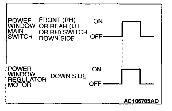 When the front (RH) or rear (LH or RH) switch on the power window main switch is pushed down, the system energizes its respective power window regulator motor, and then passenger's or rear door window glass lowers.