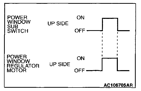 When the power window sub switch (FRONT) or power window sub switch (REAR: LH or RH) is pulled up, the system energizes its respective power window regulator motor, and then the passenger's or rear door window glass rises.