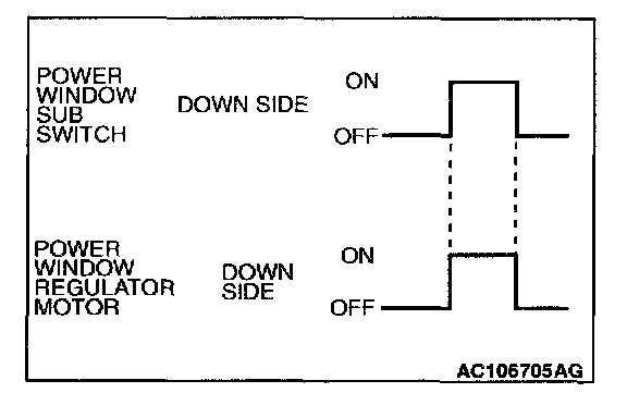 When the power window sub switch (front) or power window sub switch (REAR: LH or RH) is pushed down, the system energizes its respective power window regulator motor, and then the passenger's or rear door window glass lowers.