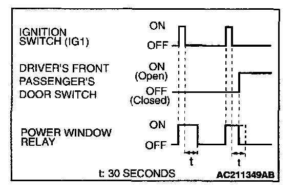 When the ignition switch is turned to the "ON" position, the power window relay is turned ON. After the ignition switch is turned OFF, the system continues to turn ON the power window relay for about 30 seconds and to enable the opening and closing of the door window by the power window switch. When the driver's or front passenger's door is opened while the timer is in operation, the power window relay will be turned OFF.