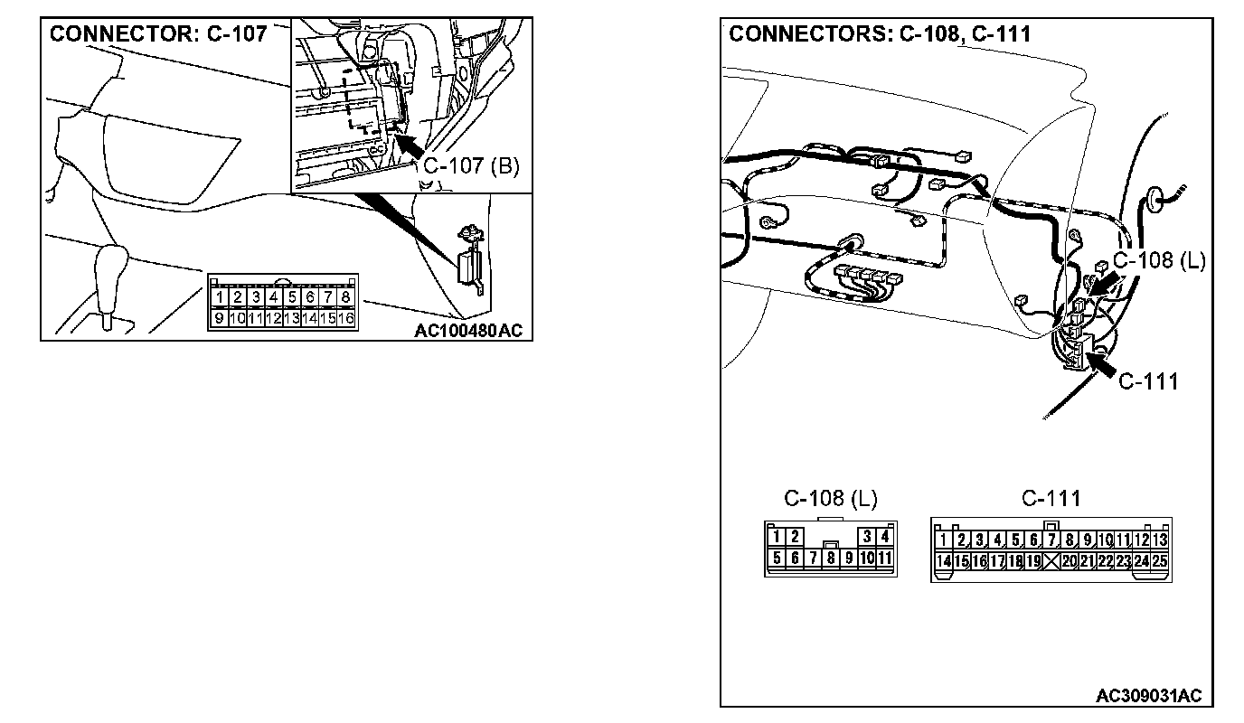 STEP 10. Check auto-cruise control-ECU connector C-107 and intermediate connector C-108, C-111 for loose, corroded or damaged terminals, or terminals pushed back in the connector.