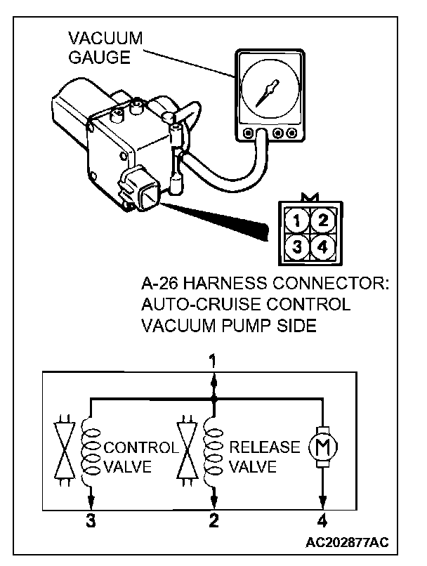 a. Connect the positive battery terminal to auto-cruise vacuum pump connector terminal 1, and the negative battery terminal to terminals 2, 3, and 4. The vacuum gauge should read 27 kPa (8.0 in Hg) or more.